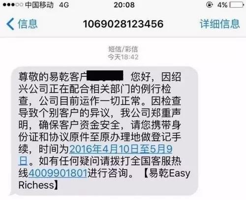 2016年4月8日,易乾财富就被曝出被查,多家位于绍兴的门店被封。对此,4月10日和11日,易乾相继发布消息称,该公司绍兴部分机构被查是例行检查,且部分门店已恢复营业。期间,易乾还多次强调,其全国均在正常营业、正常经营。