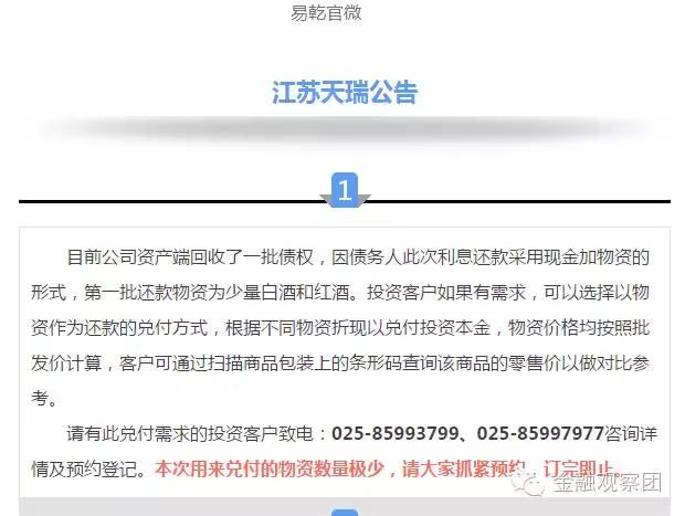 2016年11月15日晚间,易乾财富官方微信发布公告,称目前公司资产端回收了一批债权,因债务人此次利息还款采用现金加物资的形式,第一批还款物资为少量白酒和红酒。