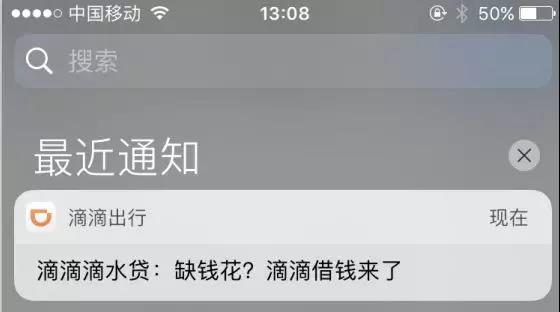 互联网金融新闻中心发现,滴滴出行近日在不断向用户推送其滴水贷产品。一方面,通过滴滴出行APP推送消息:“滴滴滴水贷:缺钱花?滴滴借钱来了”。这一推广消息与一些现金贷平台推广套路相似。