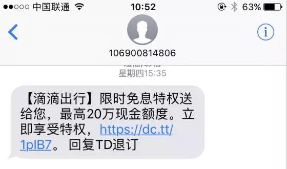 另一方面,滴滴通过短信等形式向用户推广滴水贷,并宣称“限时免息,最高可享受20万现金额度”。据了解,该渠道仅限滴滴开放邀请的用户方可申请。