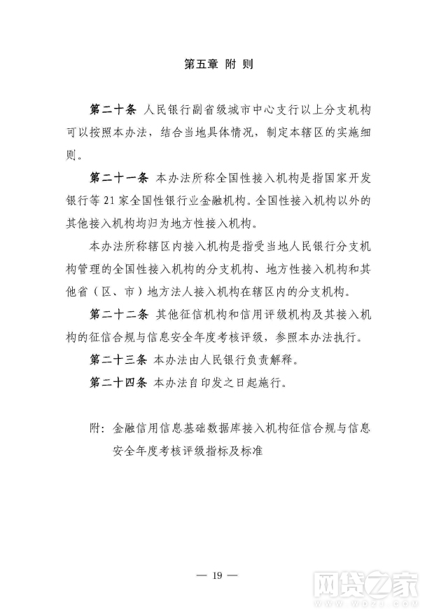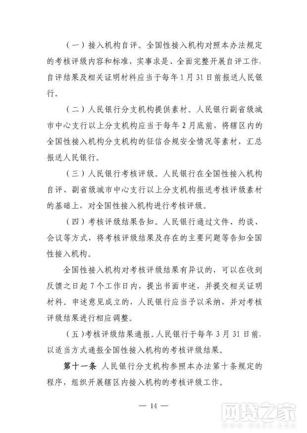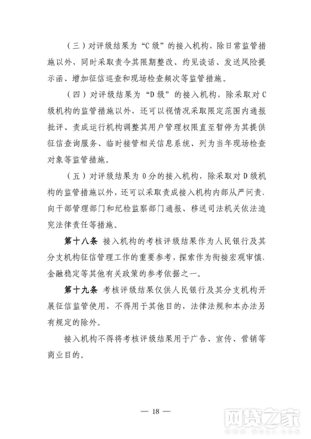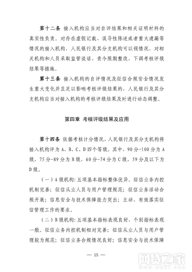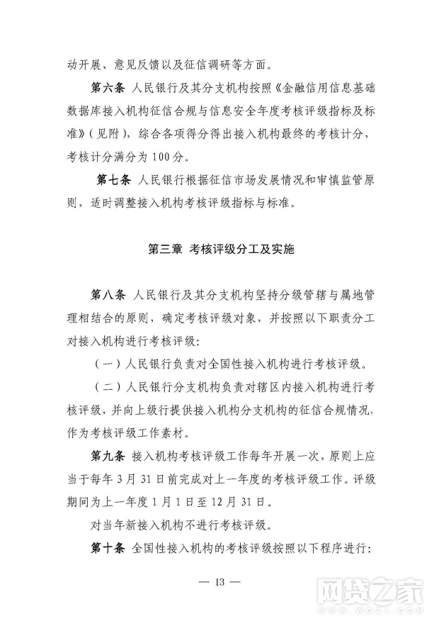 人民银行建立接入机构征信合规与信息安全年度考核评级制度(见附件3)。对接入机构的考核评级结果,将作为实施征信现场执法检查、中央银行对金融机构内部评级、对征信查询服务费用实行优惠、调整对征信系统的查询权限、确定金融机构存款保险评级结果和核定金融机构存款保险费率等的重要依据。