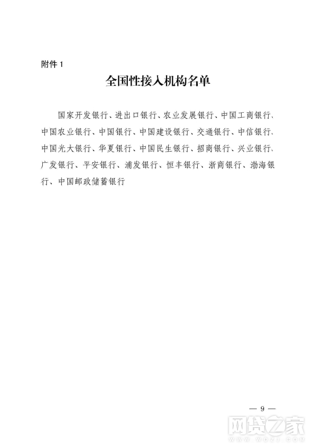 根据102号文,全国性接入机构名单包括:国家开发银行、进出口银行、农业发展银行、中国工商银行、中国农业银行、中国银行、中国建设银行、交通银行、中信银行、中国光大银行、华夏银行、中国民生银行、招商银行、兴业银行、广发银行、平安银行、浦发银行、恒丰银行、浙商银行、渤海银行、中国邮政储蓄银行。