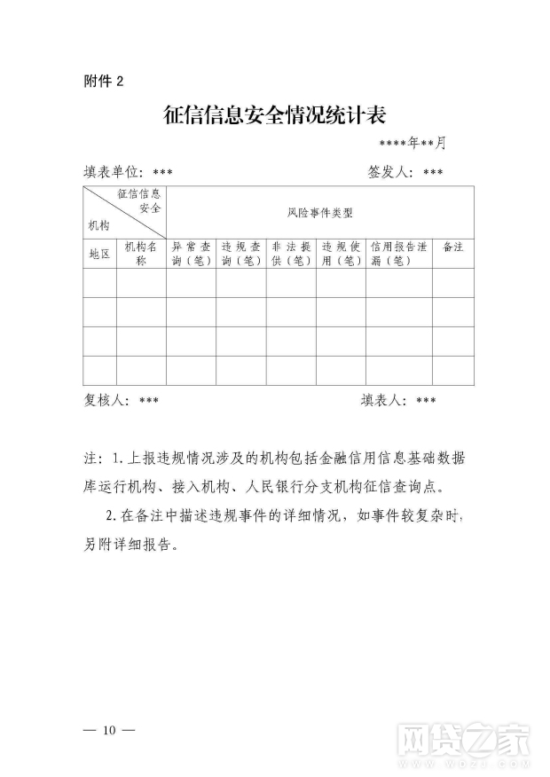 运行机构和接入机构应按月定期向人民银行报送异常查询、违规查询、非法提供、违规使用、信用报告泄漏等征信信息安全情况统计表(见附件2)。未发生征信信息安全风险事件的,应采取零报告制度(即在表中填报“0”)。发生征信信息安全风险事件的,应立即上报相关情况。全国性接入机构的总行应于每月初10日内将上月情况报送人民银行征信管理局;地方性接入机构和全国性接入机构的分支机构应于每月初6日内将上月情况报所在地人民银行分支机构;人民银行副省级城市中心支行以上分支机构应于每月初10日内将汇总的辖区内上月情况(包括人民银行分支机构征信查询点情况)报送征信管理局。