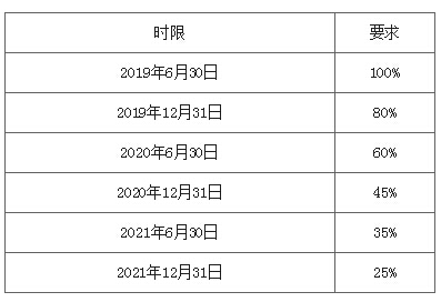 对于2018年底未达到本办法规定的同业客户风险暴露监管要求的商业银行,应在过渡期内按照下表规定的分阶段达标要求,逐步降低同业客户风险暴露。例如,2019年6月30日前,同业客户风险暴露应压缩至一级资本净额的100%以下(含),以此类推。
