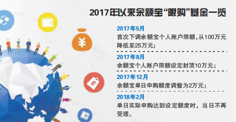 快速规模扩容背后也引起监管部门的关注,余额宝自2017年开始“降温”。2017年5月以来,天弘基金三次下调余额宝申购和持有额度,个人账户持有额度由最高100万元降至10万元,单日购买额度设置了2万元上限。