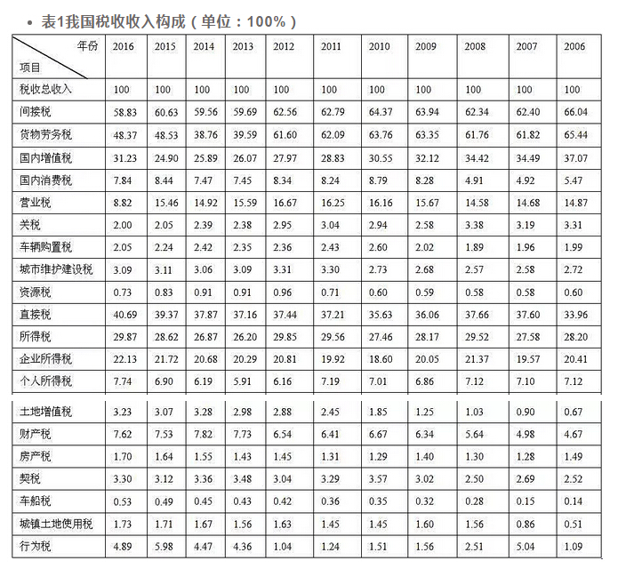 这种状况一直延续到21世纪初,从1995至2001年,直接税占税收总额的比重都在30%以下,平均值仅23.8%。之后,间接税与直接税在税收总收入中的占比逐渐出现此消彼长的局面。作者采集了2006至2016年我国税收收入构成的数据,制作成下表1。