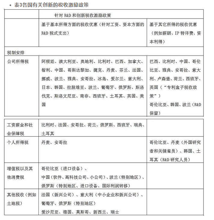 事实上,针对R&D方面的税收优惠政策已在全球范围内广泛运用,并且大多数通过公司所得税、个人所得税、工资薪金和社会保障税等直接税来实现。见下表: