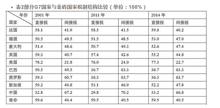 再从国家之间的比较来看,虽然21世纪以来,我国直接税比重呈小幅上升趋势,但直接税比重远低于间接税比重,且低于G7国家和其他金砖国家的直接税比重。表2是部分G7国家与金砖国家税制结构比较。