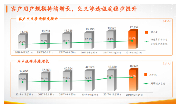 在用户增长方面,平安集团个人客户总量为1.73亿,同比增长25.4%。同时,随着平安互联网业务持续深化发展,截至2018年3月31日,平安互联网用户量达4.59亿,同比增长22.0%,其中APP用户量3.94亿,同比增长48.8%。
