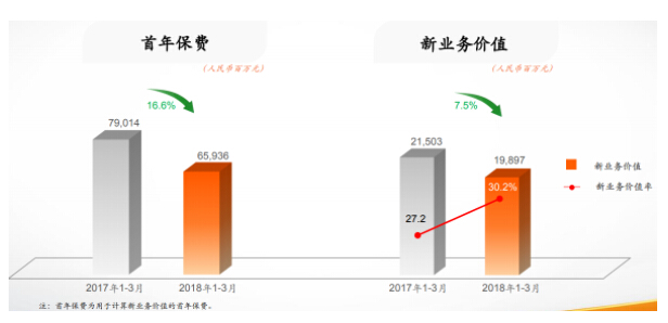在新业务价值方面,中国平安今年一季度从215亿元减少到199亿元,同比下降7.5%。首年保费也从790.1亿元下降到659亿元,同比跌16.6%。