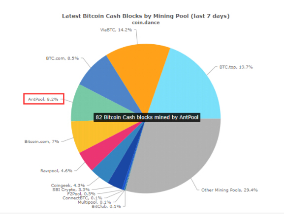 根据比特币数据网站CoinDance的数据,在过去一周内,蚂蚁矿池共挖出82个比特币现金区块,占总量的8.2%,份额可谓不小。