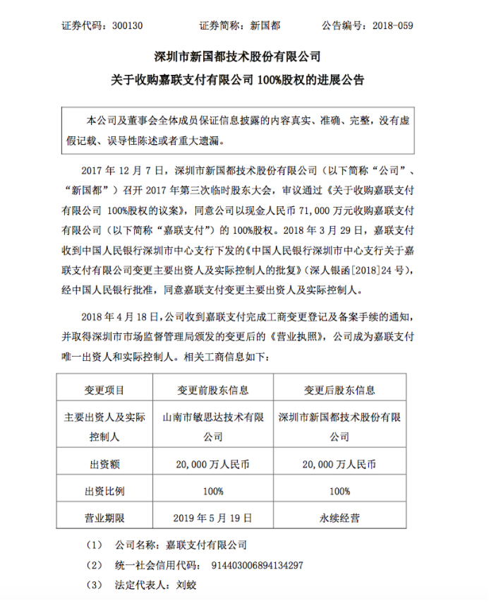 转载请标注:信息网——新国都7.1亿收购嘉联支付 成其全资控股股东