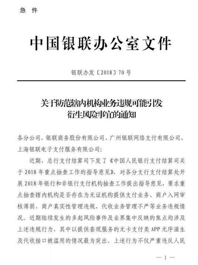 银联此举意在进一步防范金融风险,一旦放任无卡支付类APP的无序滋生,可能沦为线上养卡套现的工具,并连锁性的引发信用风险、舆情风险等事件。