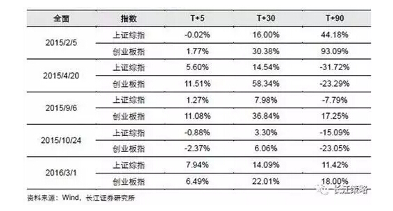 分别统计从2014年以来,定向降准和全面降准之后5个交易日、30个交易日以及90个交易日,上证综指和创业板指数的表现: