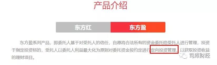 另据东银金服官网,“东方盈”系列产品为定向委托投资类产品,即委托人基于对受托人的信任,自愿将合法所有的资金委托给受托人进行管理,投资于指定投资标的,受托人以委托人利益最大化为原则对委托资金按约定进行定向投资管理,以获取投资收益的理财项目。