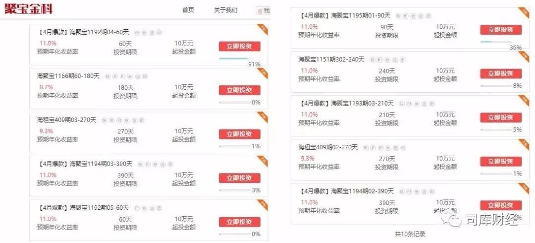 司库财经登录聚宝匯官网发现,截至发稿,聚宝金科仍然在销售海聚宝、海租宝、旅发宝等定向委托投资产品。以【4月爆款】海聚宝1193期03-210天和【4月爆款】海聚宝1195期01-90天为例,融资主体均为天津博昱企业管理有限公司,起投金额均为10万元,限购金额均为3000万元,合计6000万元。