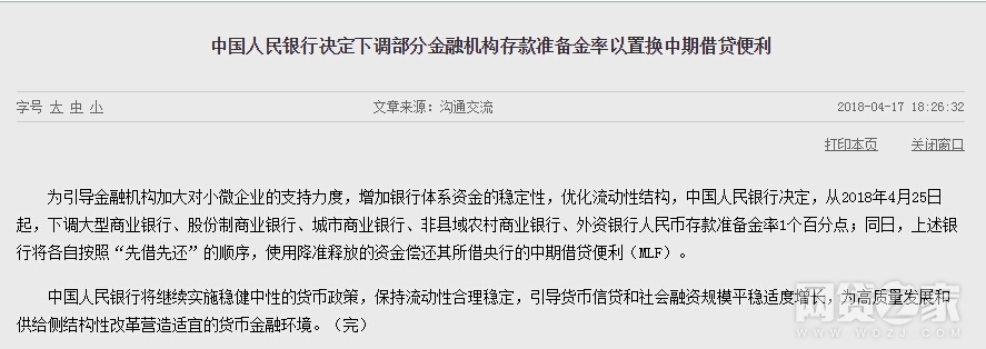 中国人民银行决定,从2018年4月25日起,下调大型商业银行、股份制商业银行、城市商业银行、非县域农村商业银行、外资银行人民币存款准备金率1个百分点;同日,上述银行将各自按照“先借先还”的顺序,使用降准释放的资金偿还其所借央行的中期借贷便利(MLF)。