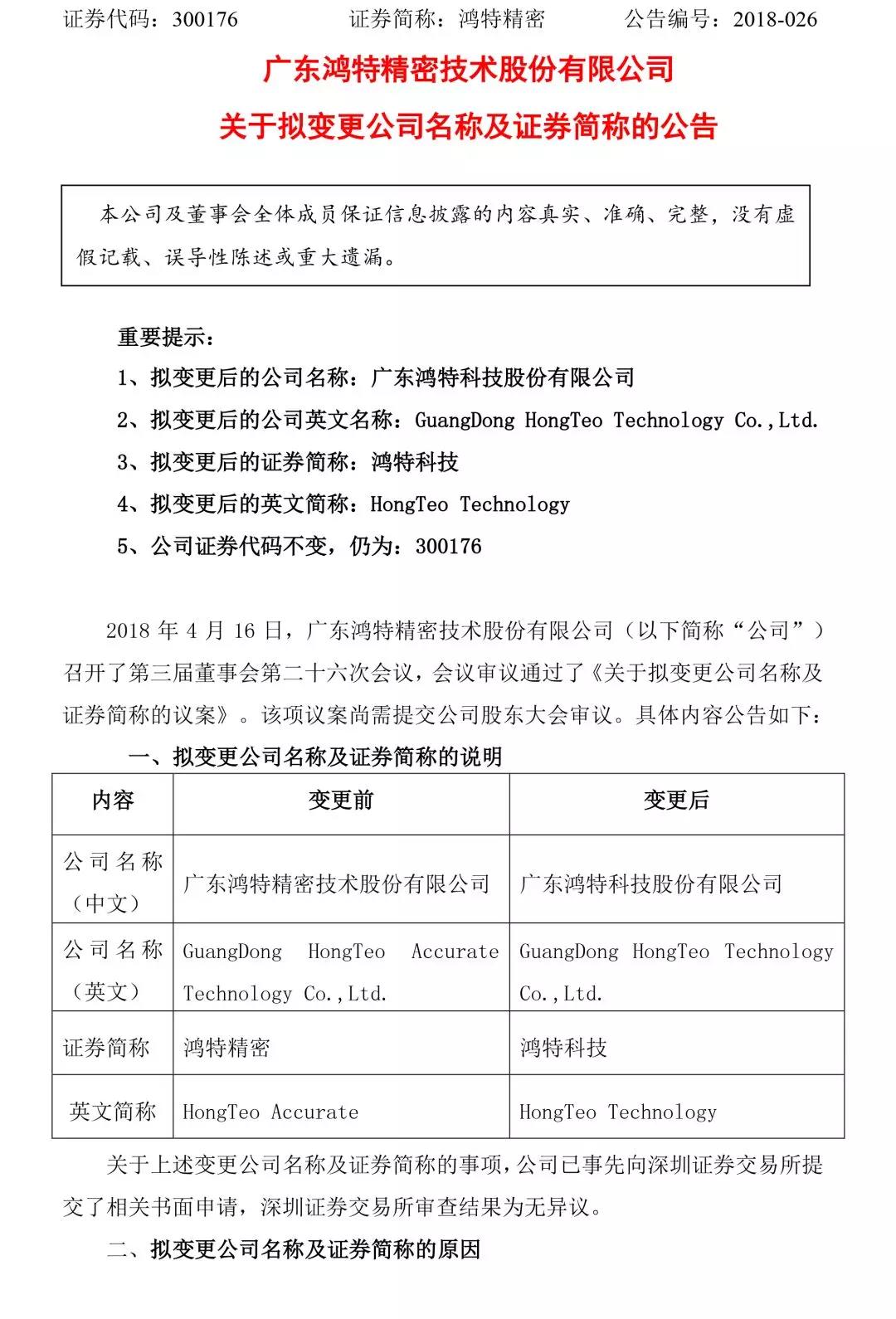 网络整理 2021-03-22 17:15网贷之家讯 4月16日傍晚,派生集团战略合作伙伴万和集团旗下的上市公司鸿特精密(300176.SZ)发布公告称:拟将公司名称由“广东鸿特精密技术股份有限公司”变更为“广东鸿特科技股份有限公司”(以工商行政主管部门最终核准的名称为准);同时,拟将公司证券简称由“鸿特精密”变更为“鸿特科技”,公司证券代码“300176”保持不变。
