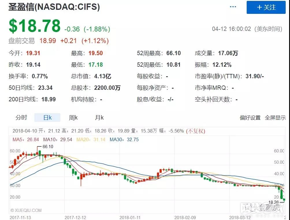 受做空的影响,圣盈信股价一落千丈,目前,圣盈信股价18.78美元,较上市初创造的66.1美元的高价,股价已经缩水了71%。