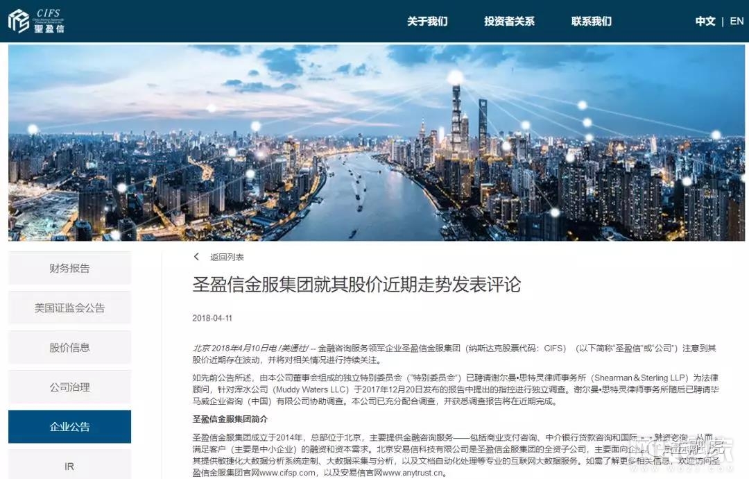 最新消息显示,“浑水”日前发声称将继续做空国内金融服务咨询公司圣盈信。