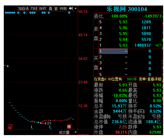 至9点45分,乐视网跌停板封单达148万手,短短15分钟卖单翻倍。