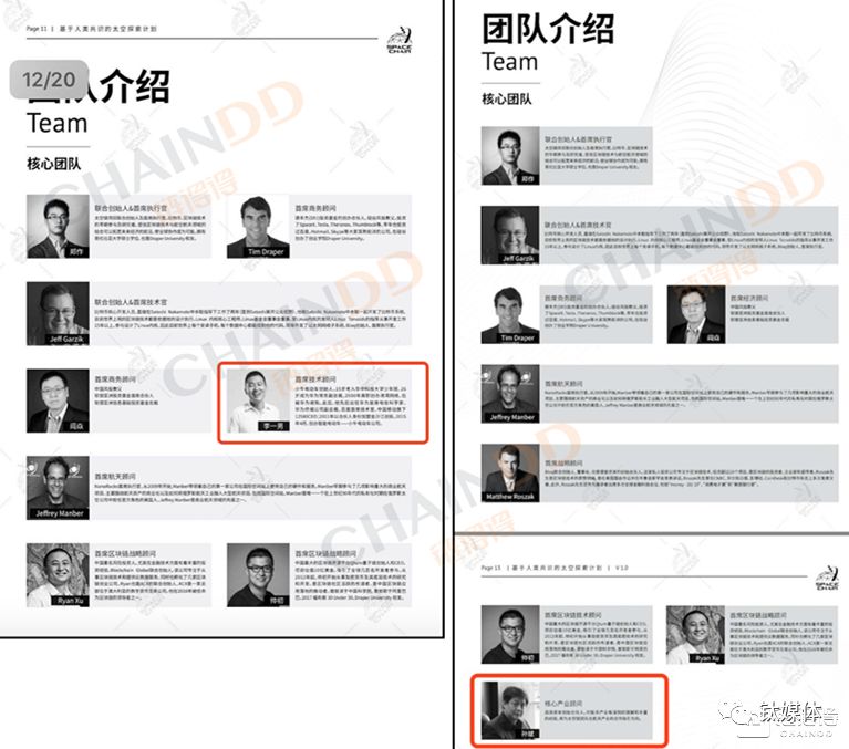 在太空链现行公开的最新公募版白皮书核心团队板块,依然清晰地展示着几个在区块链和资本行业耳熟能详的名字:“中国风投教父”阎焱、量子链创始人CEO帅初、比原链创始人段新星、比特币核心开发人员Jeff Garzik等等。另外,薛蛮子也作为太空链明星投资人被反复提及。