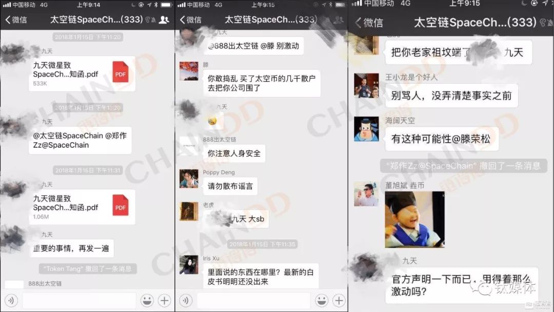 告知函一经发布,群里立刻炸锅。这引起了群中太空链工作人员的强烈反弹,并对九天微星的工作人员恶语相加,甚至进行了人身威胁,随后将九天微星的所有人踢出群聊。与此同时,在这个敏感时间点出现的变数也在大量区块链社区内迅速扩散开来,引发了众多太空链项目投资人严重关切。