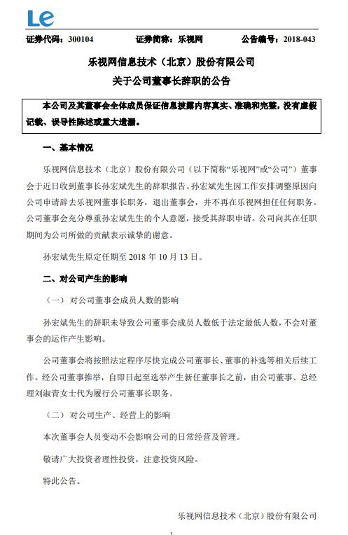 周三,乐视网公告显示,孙宏斌先生因工作安排调整原因向公司申请辞去乐视网董事长职务,退出董事会,并不再在乐视网担任任何职务。