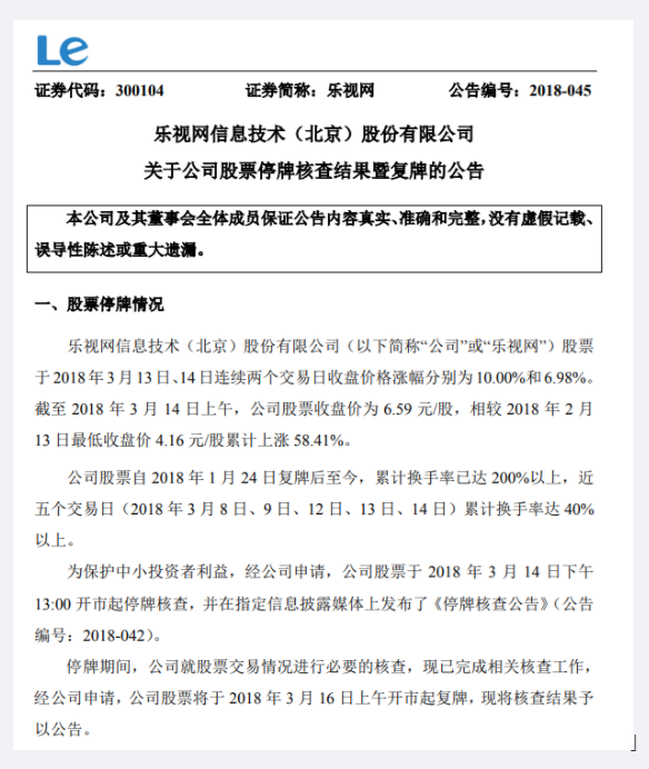 乐视称在停牌期间,公司就股票交易情况进行必要的核查,现已完成相关核查工作,经公司申请,乐视网股票将于2018年3月16日上午开市起复牌。