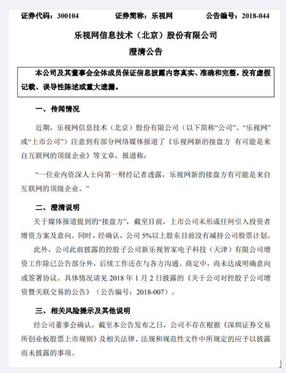 乐视网澄清称: