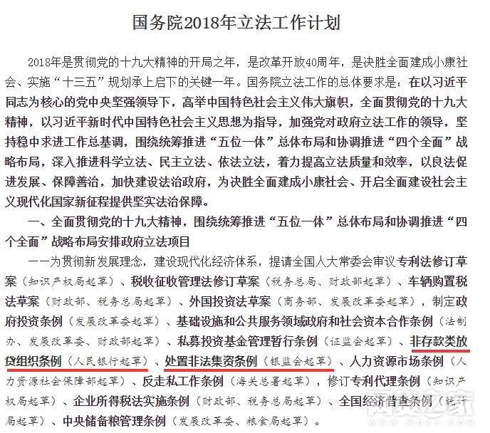 网络整理 2021-03-22 17:35网贷之家讯 3月14日,国务院办公厅发布“关于印发国务院2018年立法工作计划的通知”,对2018年的立法工作作出安排,《非存款类放贷组织条例》、《处置非法集资条例》等被列进“提请全国人大常委会审议”的立法项目。