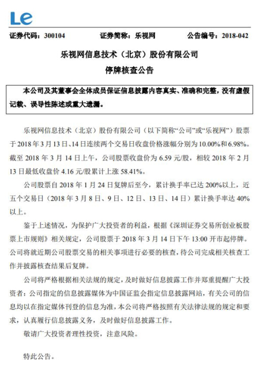 公告还显示,乐视网股票于3月14日下午13:00开市起停牌,公司将就近期公司股票交易的相关事项进行必要的核查,待公司完成相关核查工作并披露核查结果后复牌。