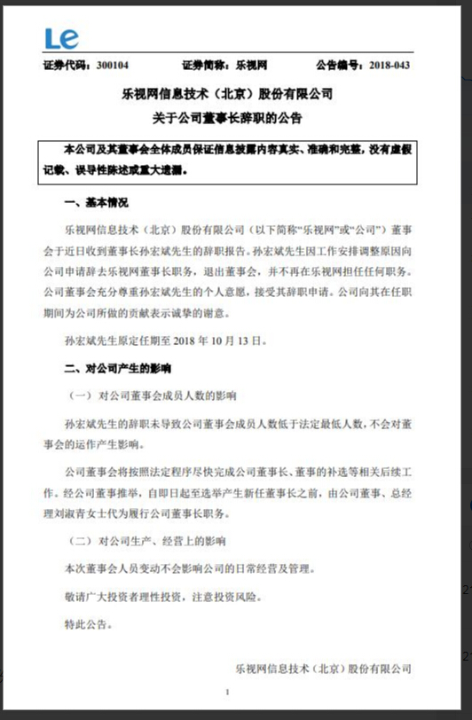 网络整理 2021-03-22 17:35周三,乐视网公告显示,孙宏斌先生因工作安排调整原因向公司申请辞去乐视网董事长职务,退出董事会,并不再在乐视网担任任何职务。