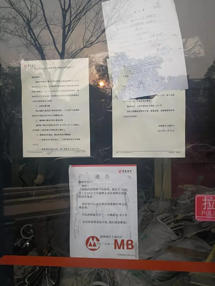 这可不是银行网点翻修,而是彻底关停了。门上贴着的告示条显示,该行因租约到期将不再续租,从2018年1月24日下午起,终止自助网点设备的对外服务。