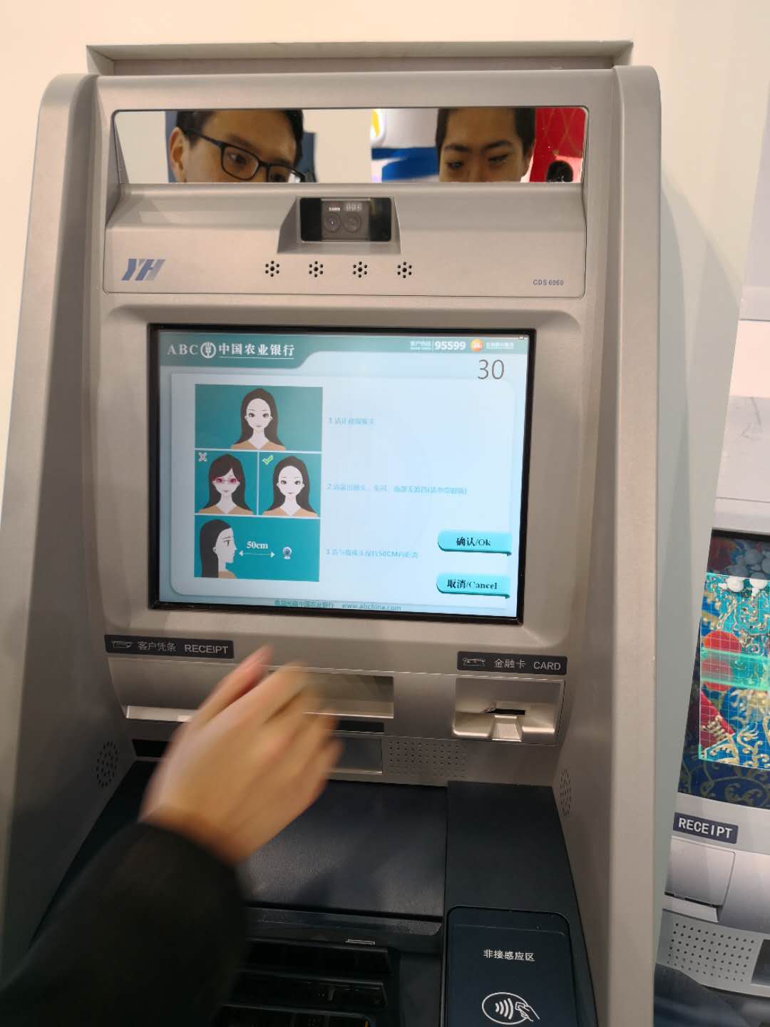 更有甚者,第一财经记者在2017北京国际金融博览会上见到,农业银行展区展览的刷脸取款,无需插入银行卡,通过正视摄像头,保持与摄像头50cm内距离,便可完成银行卡和身份的识别。