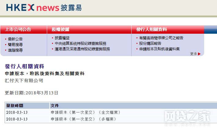 网络整理 2021-03-22 17:36网贷之家讯 3月13日,第三方支付公司汇付天下有限公司向香港联合交易所(港交所)提交了IPO上市申请,成为继维信金科(3月5日提交)后,又一家在港交所提交上市申请的中国互联网金融公司。