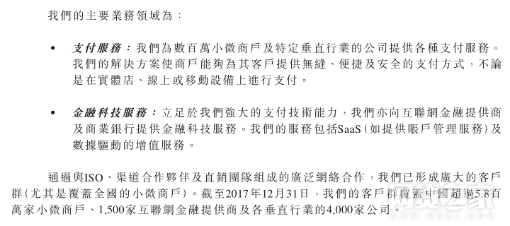 据悉,汇付天下于2006年6月23日在上海成立。根据招股书,公司的主要业务领域包括:支付服务、金融科技服务。截至2017年年底,公司客户群覆盖中国超过5.8万家小微商户、1500家互联网金融公司及各垂直行业4000家公司。
