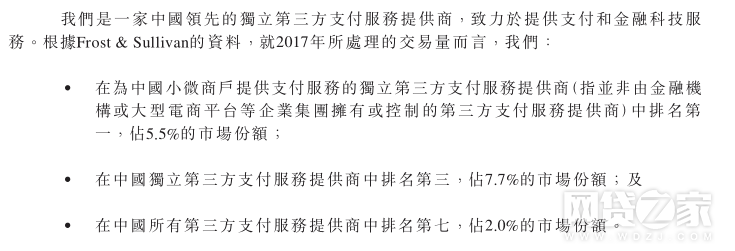 招股书显示,就2017年所处理的交易量而言,汇付天下在中国独立第三方支付服务提供商中排名第三,占7.7%的市场份额。在中国所有第三方支付服务提供商中排名第七,占2.0%的市场份额。