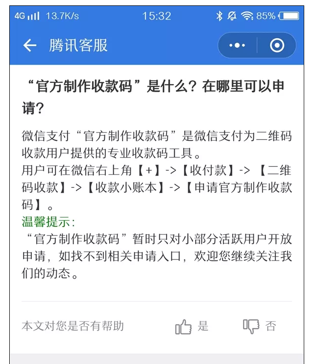 因为这个码向小商户开放,也就是说,微信会根据——你的普通收款二维码,使用天数、笔数、金额,考虑要不要给你“官方收款码”资格。