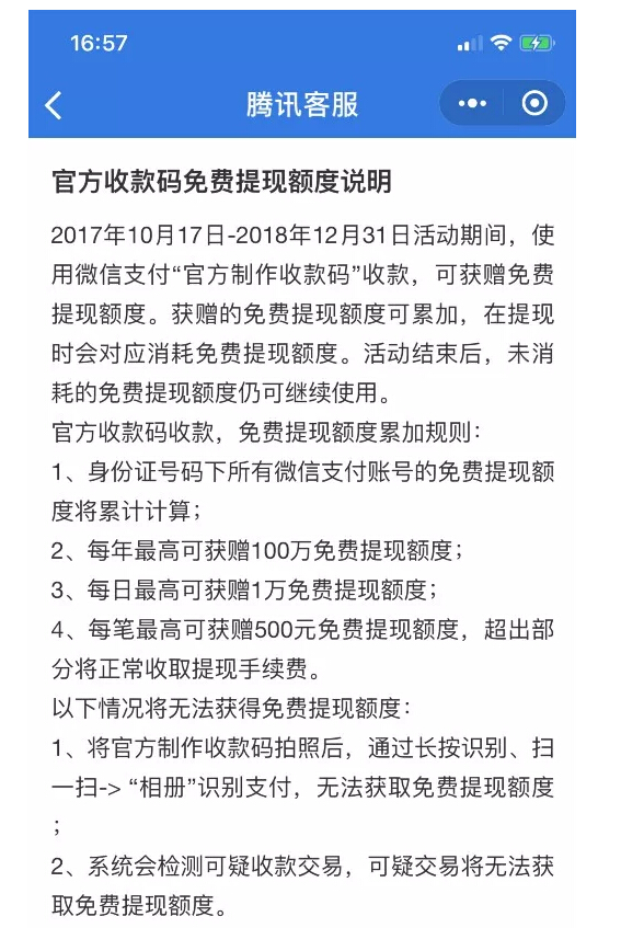 截止2018年12月31日,商户使用“官方收款码”进行收款,可以累加免费提现额度。