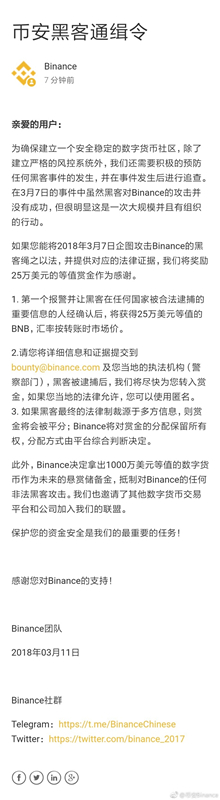 3月11日晚间,币安交易所发布《币安黑客通缉令》(以下简称“《通缉令》”)。《通缉令》称,如有用户能将2018年3月7日企图攻击币安的黑客绳之以法,币安将拿出25万美元等值的BNB(币安币)。此外,币安决定拿出1000万美元等值的数字货币作为未来的悬赏赏金,抵制对币安的任何非法黑客攻击。