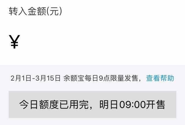 2018年1月31日,天弘基金发布公告称,“为防止余额宝货币市场基金规模过快增长并保持长期稳健运行”,自2月1日至3月15日,将“设置余额宝每日申购总量,当天售完为止”,这意味着用户转入资金的受限:一旦单日总申购额度达到限额,当日内余额宝便不再受理申购,用户只能选择在次日9时继续尝试转入。