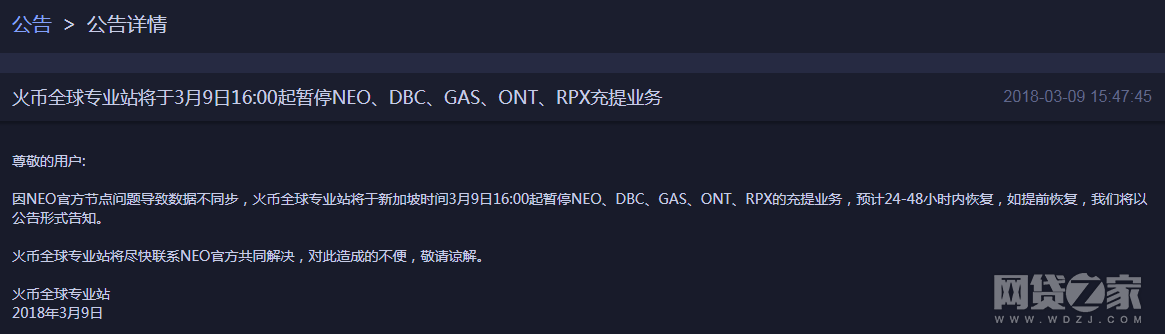 转载请标注:信息网——火币全球专业站公告暂停多种数字货币充提业务