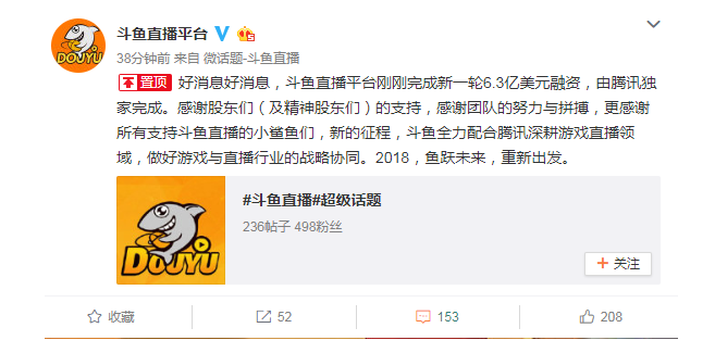 转载请标注:信息网——腾讯独家投资!斗鱼完成新一轮6.3亿美元融资