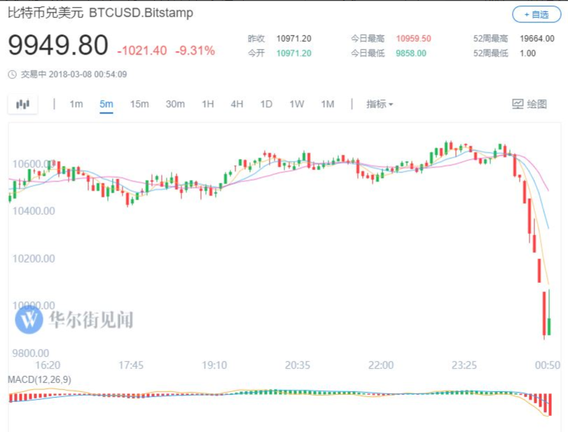 网络整理 2021-03-22 17:40据数字货币交易平台Bitstamp报价,比特币在周三美股午盘急速下跌,跌破了1万美元的整数心理位,为2月26日以来首次。过去24小时内跌超1000美元或10%,今年共五次跌破1万关口。