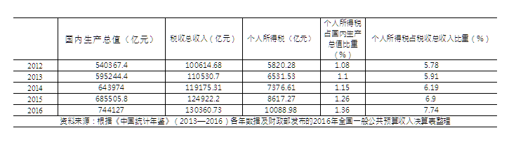 1994年《中华人民共和国个人所得税法》修订颁布正式实施以来,个人所得税增长迅速,已经成为税收收入增长最快的税种。从表1可以看出,2012——2016年个人所得税占GDP的比重以及个人所得税占税收总收入的比重都呈稳步增长态势。
