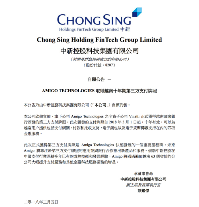 转载请标注:信息网——中新控股获越南支付牌照 旗下平台布局现金贷