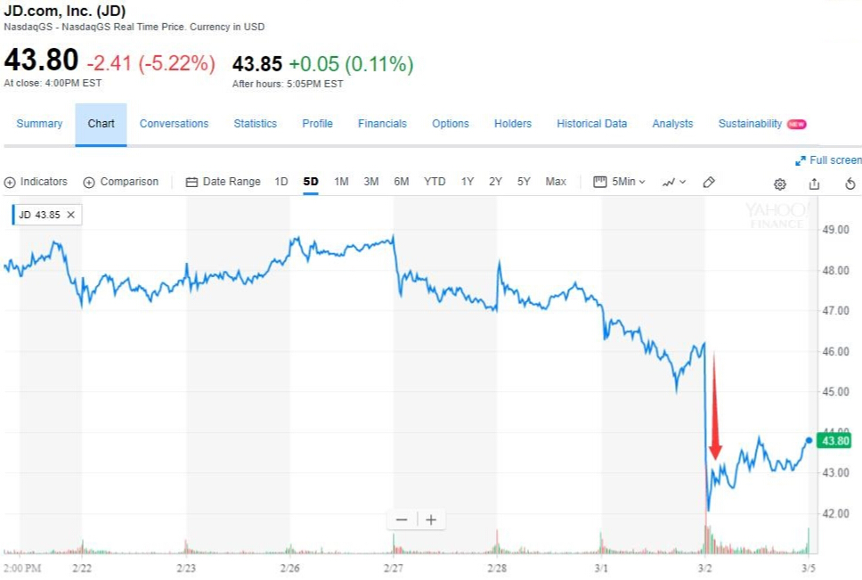 由于收益不及预期,数据出炉后,本周五中概股京东盘前股价大跌7%。开盘后进一步走低,跌幅一度接近9%,后跌幅有所收窄,最终收跌5.22%。