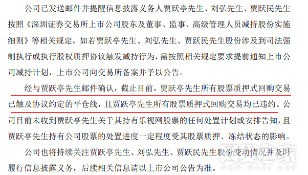 公告中并强调,经与贾跃亭邮件确认,截止目前,贾跃亭所有股票质押式回购交易已触及协议约定的平仓线,且贾跃亭先生所有股票质押式回购交易均已违约。乐视网目前尚未收到贾跃亭关于其持有乐视网股票的任何处置计划或安排告知。