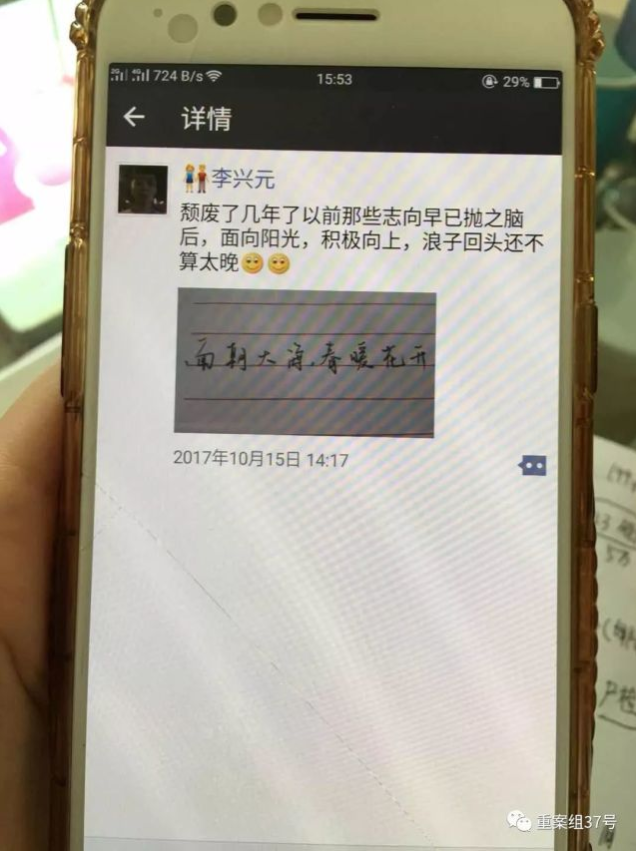 2017年10月15日,李兴元还发过一条朋友圈:“颓废了几年后,以前那些志向早已抛之脑后,面向阳光,积极向上,浪子回头还不算太晚。”并配了张手写的“面朝大海,春暖花开”。